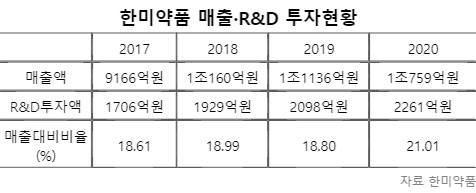 금융감독원 전자공시시스템에 따르면 한미약품은 지난해 매출액의 21%에 해당하는 2261억원을 연구개발에 투자, 매출 대비 투자 비중이 가장 높은 제약사로 나타났다. 이는 전년보다 약 8% 증가한 금액이다. 한미약품은 현재 항암, 대사성질환, 희귀질환등 30여 개에 이르는 신약 파이프라인 글로벌 상용화를 위한 연구개발을 진행 중이다.