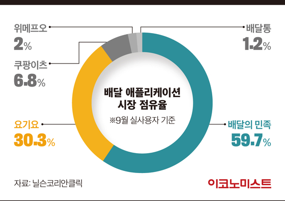 하지만 배달 앱 시장이 급격하게 커지고, 경쟁사 배달애플리케이션이 잇따라 나오면서 상황은 바뀌었다. 닐슨코리안클릭에 따르면 지난해 9월 기준 시장점유율은 ‘배달의민족’ 59.7%, ‘요기요’ 30.3%, ‘쿠팡이츠’ 6.8%, ‘위메프오’ 2%, ‘배달통’ 1.2%를 기록했다.