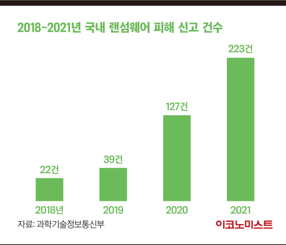 지난해 과기정통부에 접수된 랜섬웨어 해킹 피해 신고 건수는 223건으로 집계됐다. 2020년까지만 해도 127건에 그쳤던 랜섬웨어 해킹 피해 신고 건수가 1년 새 76% 증가한 것이다. 지난 1월 한 달 동안 접수된 랜섬웨어 피해 신고 건수도 19건을 기록했다. 최근 3년간 1월에는 평균적으로 5건의 랜섬웨어 피해 신고가 접수됐는데, 올해는 피해 사례가 3.8배 늘었다.