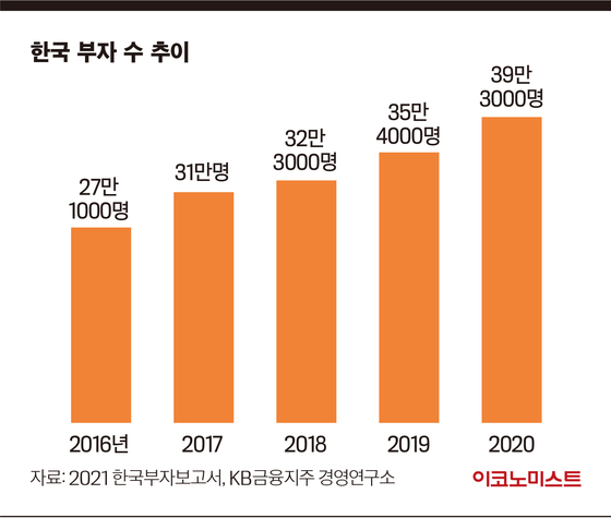 KB금융그룹의 ‘2021 한국부자(富者)보고서’에 따르면, 한국 부자의 수는 2020년 말 기준으로 39만 3000명, 전년 대비 10.9% 증가했다. 부자의 금융자산 규모도 크게 증가했다. 2020년 말 기준 한국 부자가 보유한 총금융자산은 2618조원으로, 2019년 대비 21.6%나 늘었다. 역대 최고 증가율이다.