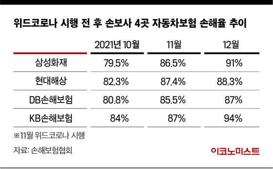 손해보험업계에 따르면 지난해 11월 기준 국내 자동차 보험시장 85% 이상을 점유 중인 삼성화재·현대해상·DB손해보험·KB손해보험 등 주요 4개 손보사의 자동차보험 손해율은 85.5~87.4%로 집계됐다. 지난 10월 이들 손보사의 자동차 보험 손해율은 79.5~84.0% 수준이었다.