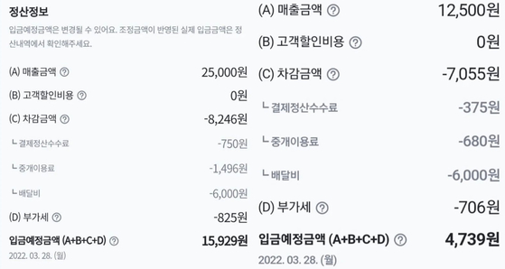 또 다른 정산정보에 따르면, 총 1만2500원이 결제된 경우에는 결제정산수수료 375원, 중개이용료 680원, 배달비 6000원, 부가세 706원으로 총 7055원 차감금액을 빼고 단 4739원만 자영업자에게 지급됐다.