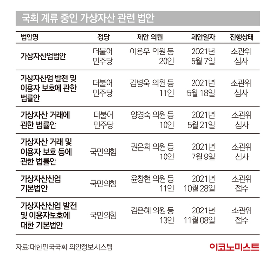 이용우 더불어민주당 의원이 지난해 5월 대표 발의한 가상자산업 법안을 시작으로, 같은 당 김병욱·양경숙 의원도 관련 내용의 법안을 발의했지만 모두 본회의 심사도 거치지 못하고 있다. 권은희·윤창현·김은혜 등 국민의힘 의원들이 대표 발의한 법안도 계류 중이다.