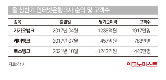 인뱅 3사의 성장은 이용 고객수가 빠르게 늘고 있기 때문이다. 올 상반기 카카오뱅크 고객수는 1917만명으로 2000만명에 육박했다. 케이뱅크는 783만명으로 전년 말 대비 65만명가량이 증가했다. 토스뱅크는 출범 이후 매달 40만명의 신규고객이 유입되며 올 상반기 고객 수가 440만명을 돌파했다.