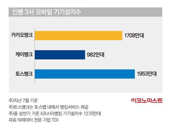빅데이터 전문 기업 TDI에 따르면 지난 7월 기준, 인터넷은행의 모바일 기기설치수는 토스가 1953만대, 카카오뱅크가 1708만대, 케이뱅크 982만대 순으로 나타났다. 토스뱅크는 따로 앱을 개설하지 않고 토스 앱 내에서 은행서비스를 제공 중이다.