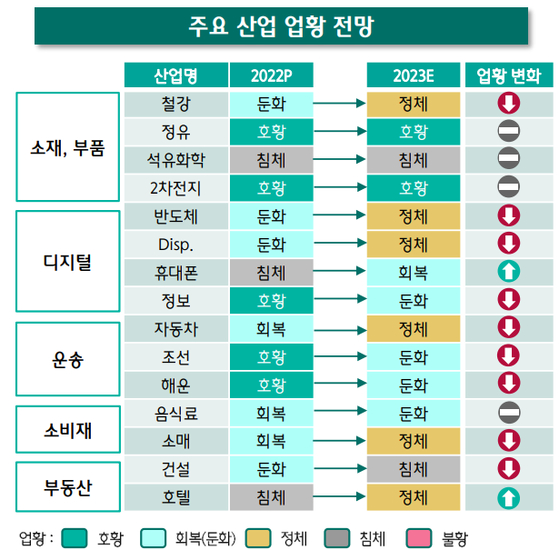 20일 하나은행 하나금융경영연구소는 ‘2023년 산업전망’ 보고서를 발간하고 총 5개 산업군, 15개 산업을 전망하면서 소재·부품 부문에서 정유 및 2차 전지를 제외한 나머지 13개 산업의 업황이 올해보다 위축되는 모습을 보일 것으로 전망했다.