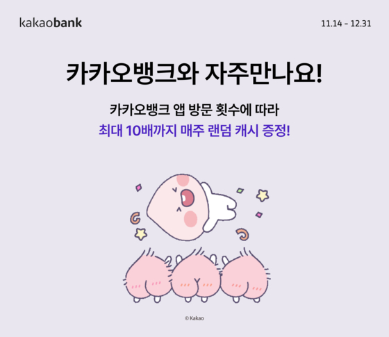 ‘자주만나요’는 다음 달 31일까지 진행된다. 카카오뱅크 앱 내 이벤트 페이지를 방문하는 고객을 대상으로 1주에 1번씩 랜덤 캐시를 제공하는 이벤트로 해당 기간 동안 카카오뱅크가 고객에 제공하는 랜덤 캐시 총액은 약 5억원 규모다. 카카오뱅크의 입출금계좌 또는 카카오뱅크 미니(mini)를 보유한 고객이면 누구나 참여할 수 있다.