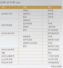 매매 거래와는 달리 대가 없이 무상으로 자산이 이전되는 상속·증여의 경우 부동산은 예상 시가보다 낮게 평가될 수 있다. <표1> 처럼 단독주택·임야·건물의 경우 시가 산정이 어렵다면 예상 시세 대비 낮은 공시지가 등으로 상속재산가액을 평가한다. 오히려 예금은 상속재산가액을 정할 때 시가로 평가하기 때문에 단독주택과 단순 비교하면 예상되는 시장가격은 동일하지만 상속재산가액을 평가할 때는 단독주택에 비해 더 비싸게 평가되는 것이다. 조금 더 구체적으로 김씨의 상속세를 계산해 보면 다음과 같다.