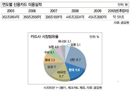 애물단지에서 노다지가 된 카드 시장을 놓고 주요 업체들의 경쟁이 치열하다. 특히 2위권 다툼이 눈에 띈다. 2010년 3분기까지의 주요 카드사 시장점유율을 보면 신한카드가 20%대 초반으로 확고하게 자리를 지키고 있으며 KB국민카드 15%, 현대카드와 삼성카드가 각각 약 11%로 시장을 나눠 갖고 있다. 체크카드를 제외한 점유율을 보면 치열한 양상이 더 드러난다. 현대카드 11.8%, KB국민카드 11.7%, 삼성카드가 11%다. 재계 1, 2위의 계열회사 그리고 전통적인 은행업 강자가 대립하는 구도다.