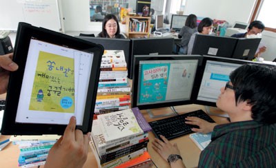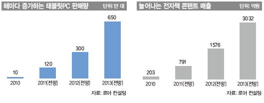 매달 나오는 전자책 2000종 넘어이제 국내로 눈을 돌려보자. 정보통신산업진흥원에 따르면 한국의 전자책 시장은 지난해까지 연간 400억~500억원 규모에 머물면서 지지부진한 흐름을 보였다. 하지만 올해 들어 분위기가 바뀌고 있다. 언제 어디서나 전자책을 꺼내볼 수 있는 스마트폰과 태블릿PC 돌풍이 전자책 시장에 활력을 불어넣고 있다.