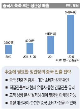 곧장 중국 본토에 공식조직을 세웠다. 2009년 10월 인삼공사 상하이(上海) 본부를 설립했고, 올해 3월 북부지사를 베이징(北京)에 열었다. 올해 2월 선전에 남부지사를, 5월에는 항저우(杭州)에 저장(浙江)지사를 만들었다. 법률·회계 등 복잡한 문제를 해결하는 전문가는 중국 현지에서 채용했다. 아울러 정관장의 유통 인프라를 갖추기 위한 노력을 계속했다. 이흥범 중국법인장은 “정관장을 판매하는 직영·위탁매장의 입지선정을 위해 설명회는 물론 타당성 세미나를 열었다”며 “국내에서 약재를 가장 많이 파는 경동시장과 같은 중약(中藥)시장을 확보하기 위한 노력도 기울였다”고 말했다.