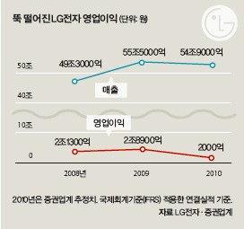 서서히 색깔을 드러내다LG전자는 작년 4분기 2457억원의 영업적자를 냈다. 연간 기준 영업이익은 1765억원으로 2009년 2조6807억원 대비 15분의 1로 줄었다.