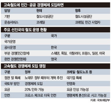 노태우 정부 시절부터 철도구조개혁 논의철도시장에 민간·공공 경쟁체제를 도입하는 방안을 두고 논란이 거세다. 국토해양부가 지난해 12월 27일 새해 업무보고에서 2015년 개통할 수서발 KTX 경부·호남선 운영을 민간에 맡기겠다”고 밝히면서부터다.