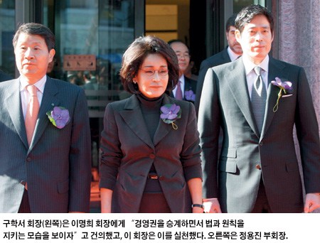 2006년 5월 중국 상하이. 이마트 산린점 개점 기자간담회에서 당시 사장이었던 구 회장은 “깜짝 놀랄 만한 수준의 세금을 내고 경영권을 승계할 것”이라고 말했다. 당시 대기업 2~3세의 편법 증여 의혹이 논란이 되고 있는 가운데 나온 말이어서 재계 안팎에서 주목을 받았다. 그 무렵 이명희 회장 부부가 갖고 있던 신세계 지분(23%)은 시가로 1조9800억원. 재산을 물려주는데 드는 세금만 당시 기준으로 1조원에 이르렀기 때문에 구 회장의 말을 믿는 사람은 그다지 많지 않았다. 심지어 재계 일각에선 재원 마련 방법과 경영권 방어 문제를 내세워 ‘대의(大義)’를 오해하는 사람도 있었다.