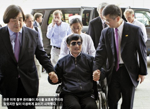 6일간의 집중적인 협상 끝에 마침내 합의가 이뤄졌다. 천과 그의 가족은 중국에 남되 해안 도시 톈진(天津)으로 이주해 천이 원한다면 그곳에서 법률 공부를 할 수 있고(내가 알기로는 그가 늘 꿈꾸던 일이다), 당국은 그의 자유를 구속하지 않는다는 내용이다. 천은 휠체어에 탄 채 미소 띤 얼굴로 대사관에서 나왔다. 사진 기자들은 천이 커트 캠벨 미 국무부 차관보와 포옹하고 게리 로크 주중 미 대사와 손잡는 모습을 사진에 담았다. 고위급회담을 위해 막 베이징에 도착한 클린턴은 이 합의가 “천의 선택과 미국의 가치관(his choices and our values)”을 반영한 결과라고 찬사를 보냈다. 하지만 천은 내게 나중에 일이 이상하게 꼬이면서(things started to unravel) “대사관측으로부터 내가 그곳에서 떠나기를 바라는 듯한 압력이 느껴졌다”고 말했다. [미국의 한 고위관리는 어떤 압력도 행사한 적이 없으며 미국 측은 천이 미 대사관에 ‘장기체류(long-term occupancy)’하게 될 경우에 대비하기 시작했다고 말했다. 스탈린 시대에 부다페스트 주재 미 대사관에 망명을 신청해 그곳에서 15년 동안 체류했던 헝가리 정치범 요제프 민드센티 추기경 등의 전례를 논의했다고 했다.]