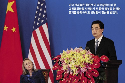 당시 경제력이 약하고 정치적으로 고립돼 있던 중국에 미국이 행사할 수 있는 영향력은 지금보다 훨씬 더 컸다. 하지만 현재 미국 정부 관리들은 그때보다 자신감이 커진 중국 정권을 상대해야 한다. 어쨌든 천의 미국 대사관 피신은 중국과 미국 양측 모두에 어려운 문제를 제기했다. 힐러리 클린턴 미 국무장관이 미·중 고위급회담 참석차 베이징을 방문할 예정이었고, 양국 외교관들은 타결점을 찾으려고 밤낮없이(around the clock) 협상을 계속했다.