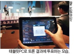 지급된 태블릿PC에는 행사 전체 일정과 40여명의 초청 연사 프로필 등 행사안내정보가 모두 담겨 있어 별도의 안내 책자가 필요 없었다. 참석자들은 갤럭시탭을 통해 SNS 메시지와 쪽지를 주고 받고, 인터넷 서핑을 하는 등 적극적으로 기기를 활용했다. 또 설득력 있는 의견에 투표와 평가를 하며 진정한 의미의 쌍방향 소통 컨퍼런스를 만들었다. 이날 토론 대결에서 승리를 거둔 퍼거슨 교수는 “나의 발언에 청중이 즉각 반응해 토론 내내 박진감이 넘쳤다”며 “탭퍼런스가 앞으로의 토론 방식에 혁신적인 변화를 겪게 될 것 같다”고 말했다.