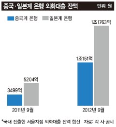 A시중은행 자금부 부장은 최근 중국계 B은행에서 한 통의 전화를 받았다. 저금리로 외화대출을 받으라는 내용이었다. 그는 “자금력을 앞세운 중국계나 일본계 은행들로 부터 돈 빌려주겠다는 전화가 자주 온다”며 “금리가 낮고 한도도 많아 돈을 빌리는 경우가 종종 있다”고 말했다.