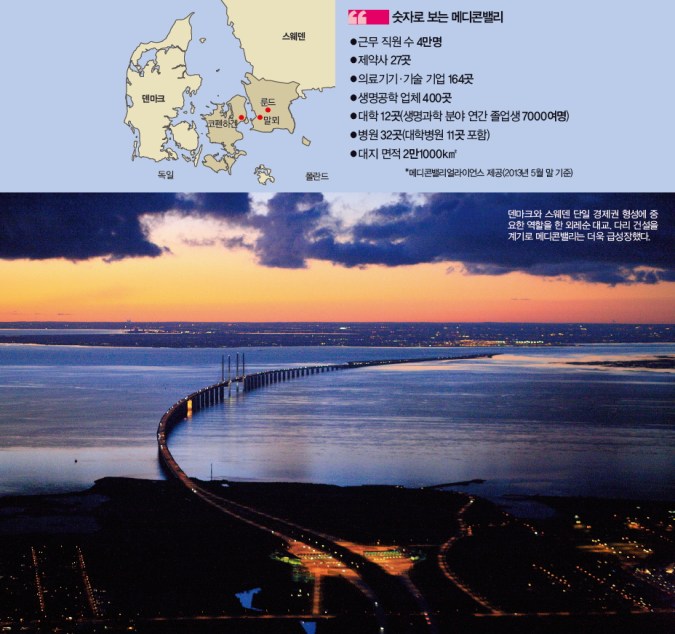 8㎞ 대교로 단일 경제권메디콘밸리는 다양한 기업이 100년에 걸쳐 만든 과학단지다. 1900년대 초반, 이곳에는 이미 건선치료약으로 유명한 제약회사 레오파마가 자리를 잡았다. 이어 인슐린 제약회사로 널리 알려진 노보노디스크과 룬드벡 등 대형 제약회사가 차례로 들어섰다. 이 회사들이 글로벌 기업으로 성장하자 이를 중심으로 의료기기 기업과 제약사·병원이 자연스럽게 모여들었다. 주로 중앙정부나 지방자치단체 주도로 형성된 다른 나라 과학비즈니스벨트와 다른점이다. 지금도 중앙정부나 지자체의 특별한 지원은 없다.