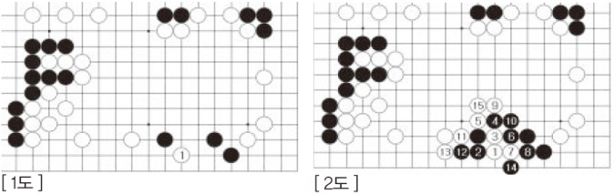 [1도]는 고수들의 실전에서 나온 장면이다. 흑집 속에 백1로 턱밑으로 들어갔다. 잡히는 것이 빤한데 왜 들어간 것일까. [2도]에서 흑2로 막으면 백3으로 올라온다. 흑4에 막으면 백이 살 길은 없다. 그러나 백5로 끊어 잡힌 들을 이용해 바깥에 세력을 구축한다. 백15로 이으면 중앙 방면에 백집이 크게 생겨 유리한 결과가 된다. 그러니까 백1로 들어간 것은 일부러 버리는 전법을 구사한 것이다. 백돌 두 점을 미끼로 던져 보다 큰 이득을 도모한 것이다.