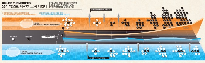 람보의 광란그렇다면 끊임없이 진화하며 우리의 의학적 무기에 내성을 발달시키는 암을 어떻게 격파할 것인가? 칼을 녹여 쟁기를 만드는 게 그 비결일지 모른다. 2009년 개튼비는 학술지 캔서리서치에 ‘적응요법(Adaptive Therapy)’이라는 제목의 논문을 발표했다. 본질적으로 암은 신속히 확산되는 ‘민감 세포’와 성장이 더딘 ‘내성 세포’로 구성된다는 가설이 그 바탕이다.