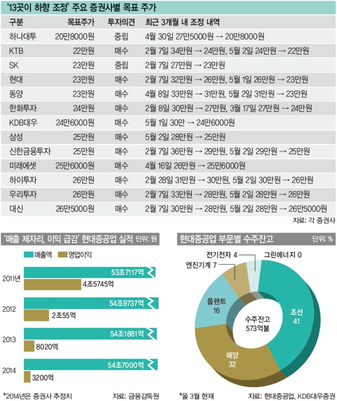 주요 증권사 중 현대중공업의 목표 주가를 그대로 둔 곳은 3곳뿐이다. 동부증권은 32만원, KB·이트레이드증권은 27만원을 유지했다. 사실 현대중공업은 누적된 실적 우려에도 증권사들이 비교적 좋은 평가를 해왔던 기업 중 하나다. 금융정보제공업체 에프앤가이드가 5월 1일 발표한 내용에 따르면 현대중공업은 10대 그룹 상장사 중 목표 주가와 실제 주가 간 괴리율이 가장 컸다. 평균 30만원 정도였던 목표 주가에 비해 실제 주가는 40% 가까이 낮은 10만원대 후반이었다.