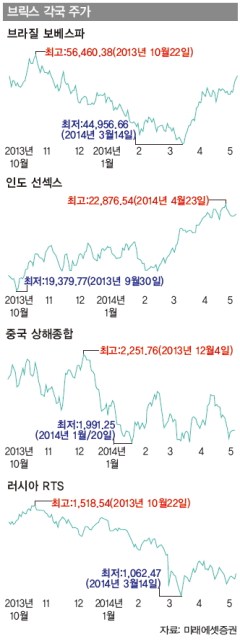 브릭스(BRICs) 국가 간 희비가 갈리고 있다. 세계 경제의 새로운 엔진 역할을 했던 브릭스 국가 주가가 각자 다른 길을 가고 있다. 지난해 침체를 극복한 브라질과 인도의 주가는 급등세를, 정국·경기 불안 등 악재를 마주한 러시아와 중국은 급락세를 보이고 있다. 유럽과 미국의 경기가 부진한 가운데서도 동반 강세를 보이던 브릭스 국가의 주가 동조현상이 깨지고 있는 것이다.