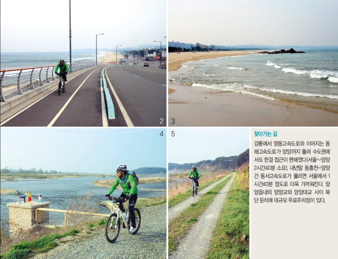 강원도 구간은 올해 완공되고, 경북과 울산, 부산 구간은 내년부터 연차적으로 조성될 예정이다. 양양 구간의 동해안 길은 일부가 공사 중이지만 지금도 자전거로 다니는 데 큰 문제가 없다. 여유가 된다면 연어 자전거길과 더불어 속초와의 경계인 물치항에서 남단의 지경해수욕장까지 35.5km의 동해안 자전거길을 함께 달려보자. 양양이 강원도의 절정인 이유를 실감할 것이다.