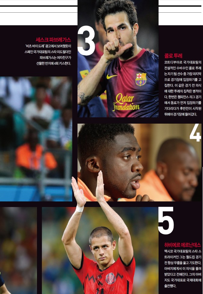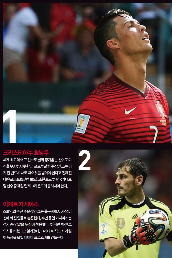2014 월드컵은 세계 일류 축구 선수들이 그라운드에서 펼치는 화려한 기량뿐 아니라 그들의 유별난 경기 전 의식을 훔쳐볼 수 있는 기회다.