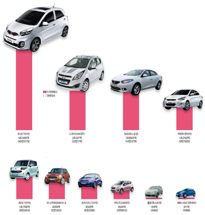 판매 대수를 기준으로 한 베스트셀링카 발표는 종종 보셨을 겁니다. 그렇다면 금액 기준 가장 잘 팔린 차는 뭘까요? 2010년 이후 국내에선 판매된 81개 경차·소형차 중 최고 인기 차량은 바로 기아차 모닝이었습니다. 4년 반 동안 판매된 금액이 무려 4조원이 넘습니다. 삼성그룹·현대차그룹·LG그룹이 올 추석에 협력사에 푸는 돈과 맞먹는 막대한 매출을 기아차 ‘모닝’ 혼자올렸습니다.