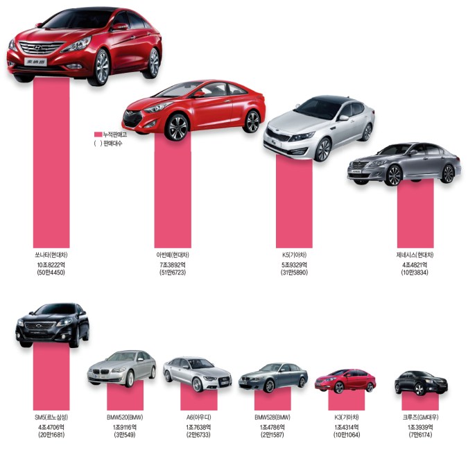 결과는 역시나 중형차 시장 터줏대감인 현대 쏘나타의 승리였습니다. 50만대 이상의 판매고를 기록한 현대차 쏘나타는 누적 매출 10조원을 넘어선 당당한 1위입니다. 지난해 수입차 공세에 밀렸던 현대차가 올해 LF쏘나타를 출시하자 내수 시장 점유율을 회복할 정돕니다.