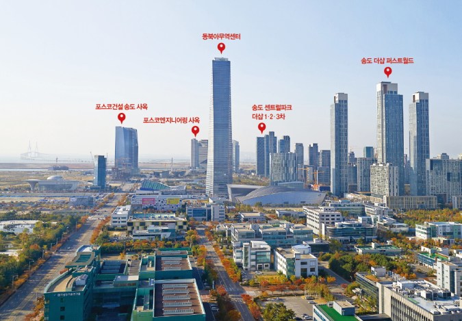 송도 개발은 포스코가 이끌고 있다. 전망대에 서면 송도국제도시 개발 현장 곳곳에 ‘POSCO’ ‘더샵‘ 등 포스코의 로고와 브랜드가 보인다. 동북아무역센터 바로 옆으로 포스코건설이 완공한 64층 규모의 초고층 주상복합아파트 ‘송도 더샵 퍼스트월드’가 손에 잡힐 듯 하다. 송도 더샵 퍼스트월드는 2005년 미국건축가협회(AIA) 뉴욕주지회로부터 주거설계상을 수상한 바 있다.