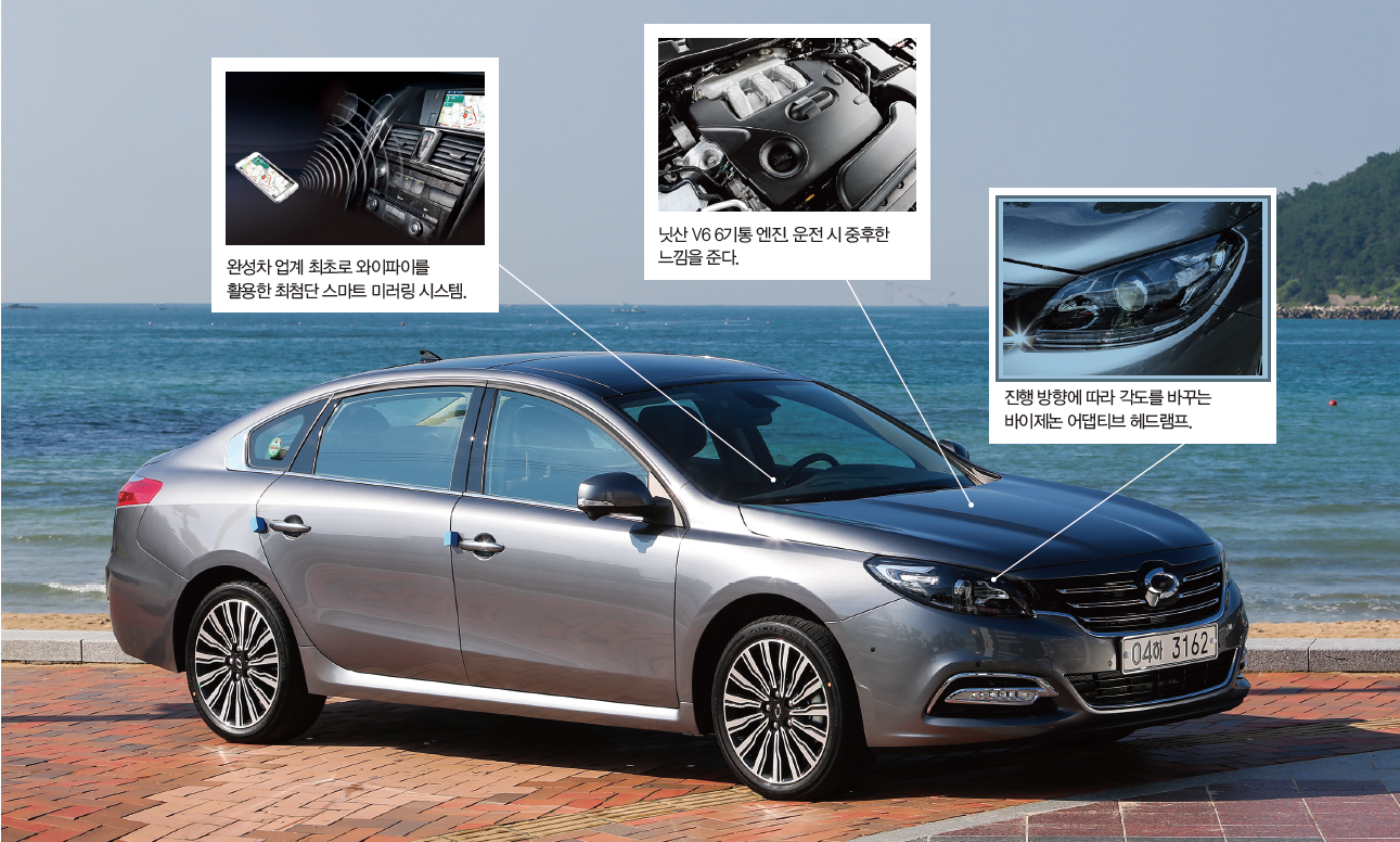 닛산의 V6 6기통 엔진을 장착해 주행성능도 높였다. 이 엔진은 미국의 자동차 전문 조사기관 워즈(Ward’s)에서 14년 연속 세계 10대 엔진으로 선정된 바 있다. 또 국내 완성차 가운데 처음으로 와이파이 통신을 활용한 스마트 미러링 시스템을 도입했다. 운전자의 스마트폰에서 내비게이션을 실행하면 그 내용이 통신사 구분 없이 차량의 모니터에 뜬다.