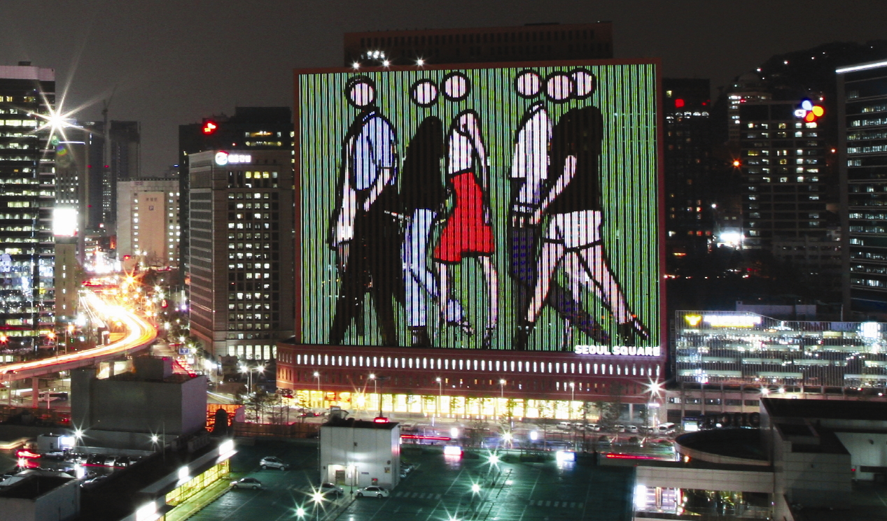 작품 감상할 수 있는 곳: 서울 중구 남대문로5가 541 서울스퀘어 서울스퀘어빌딩은 저녁 8시부터 11시까지 매 시각마다 10분씩 서울스퀘어 정면 벽면을 미디어 캔버스로 활용해 작품을 선보인다. 오피의 작품뿐만 아니라 크리스마스, 새해, 월드컵, 한글날 등 각종 기념일이나 행사를 기념해 미디어 아트 기획전이 열리기도 한다. 서울스퀘어는 과거 대우그룹의 대우센터빌딩이었다. 2007년 모건스탠리가 1조원에 가까운 돈을 들여 매입한 뒤 리노베이션하는 과정에서 외관에 미디어 파사드를 설치하기로 결정했다. 모건스탠리는 가나아트센터에 미디어 파사드 설치를 일임했고, 가나아트센터는 모건스탠리와 서울시 등과 상의해 줄리안 오피 ‘군중’을 최종 선정했다.