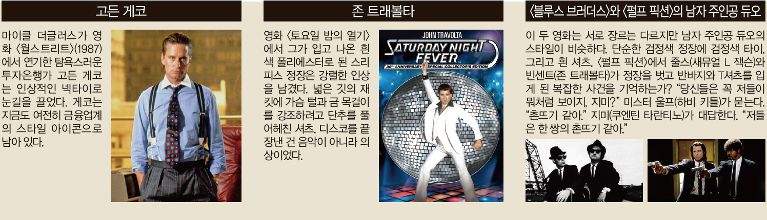 요즘 남성들 사이에 정장이 인기다. USA 네트워크의 법정 드라마 ‘슈츠(Suits)’ 시즌4가 방영 중인 TV에서 특히 그렇다. 이 드라마의 작가 겸 제작자인 아론 코시(47)는 지금은 반바지와 샌들 차림의 전형적인 ‘할리우드가 이’다. 하지만 한때는 매일 정장을 입고 출퇴근하는 뉴욕의 헤지펀드 매니저였다. “대학 시절 봄방학 때 영화 <월 스트리트> (1987)를 봤다”고 코시는 말했다. 그는 “그 영화를 보면서 거기 나오는 주인공처럼 되겠다고 마음 먹었다”고 덧붙였다. 영화의 주인공은 날렵한 정장을 차려 입은 남자였다.