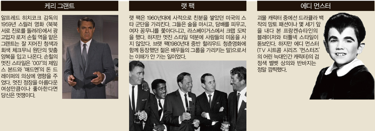 난 스포츠 전문 작가이며 편안한 스포츠웨어를 즐겨 입는다. 내 옷장 속에 있는 정장은 네 벌도 안 된다. 유감이다. 정장은 세상에서 가장 멋진 남성들이 입는 최고로 멋진 의상이기 때문이다. 영화배우 케리 그랜트, 블루스 뮤지션 제이크와 엘우드 블루스, 코미디언 폴 루벤스가 연기한 코믹캐릭터 피-위 허먼 등이 정장을 즐겨 입었다. 정장은 당신을 영화 <오션스 일레븐> 에 나오는 조지 클루니처럼 보이게 만들 수도 있다. 이와 달리 바람막이와 카키바지는 영화 <시리아나> 에 나오는 클루니 같은 분위기를 풍기게 한다. 스위스계 프랑스인 건축가 르 코르뷔지에는 “정장은 사람이 들어가 사는 기계이며 편안한 갑옷”이라며 “지금까지 고안된 패션의상 중 가장 성공적이고 오래 가는 스타일”이라고 말했다.