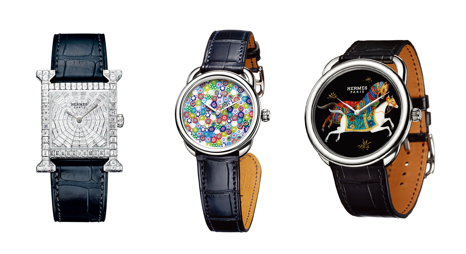 이번 전시와 함께 그동안 한국에서는 만나볼 수 없었던 ‘아쏘 쉐발 도 리앙’ ‘아쏘 밀레피오리’ ‘에이치 아워 바게트’ 등의 다양한 시계를 선보였다. 메종 에르메스의 상징적인 모티프 중 하나인 기마대에서 영감을 받아 제작된 ‘아쏘 쉐발 도리앙’은 전통적인 프랑스 도장 기술을 발전시켜 나무나 대나무가 아닌 금속에 도장을 입힌 시계다. 시계 제조술과 유리 제조술의 결합으로 탄생한 ‘아쏘 밀레피오리’는 크리스털과 에나멜을 겹겹이 쌓아 색을 낸 다채로운 유리 줄기 무늬가 특징이다. ‘에이치 아워 바게트’는 기존의 에이치 아워에 최상의 다이아몬드를 선별해 세팅한 시계다.