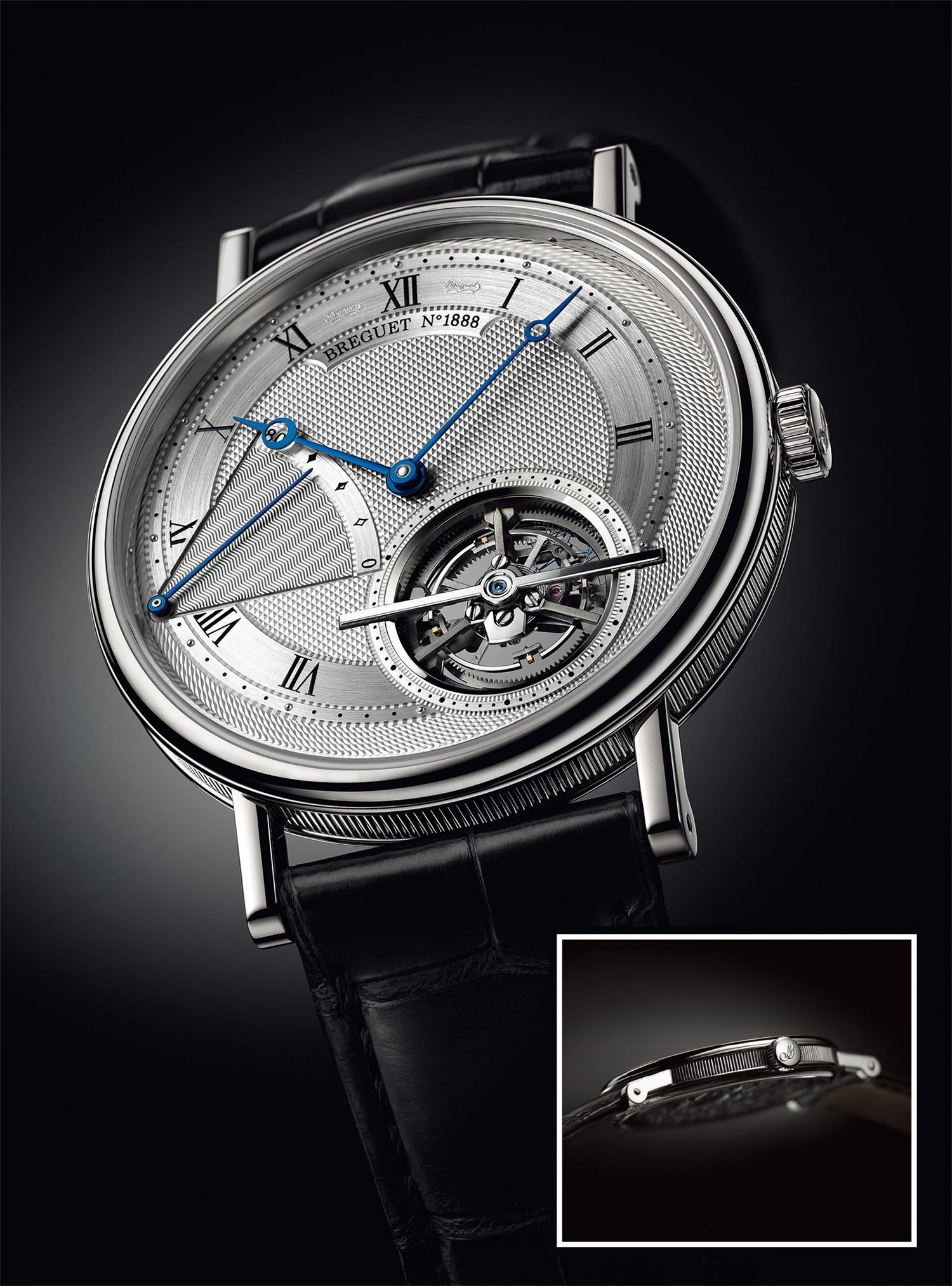 창립자 아브라함 루이 브레게가 발명한 투르비옹을 진보시키기 위한 브레게의 지속적인 노력이 드디어 결실을 맺었다. 장인 기술과 정교함으로 무장한 얇은 케이스의 ‘클래식 뚜르비옹 엑스트라-플랫 오토매틱 5377’을 탄생시킨 것. 케이스 두께는 7㎜, 무브먼트 두께는 3㎜에 불과하다. 이런 얇은 두께의 기계식 시계를 만들기 위해 플래티넘 소재의 페리페럴 로터(투르비옹을 무브먼트의 중심이 아닌 가장자리에 장착)를 고안했다. 현재 시장에 출시된 제품 중 무브먼트 두께가 가장 얇다.