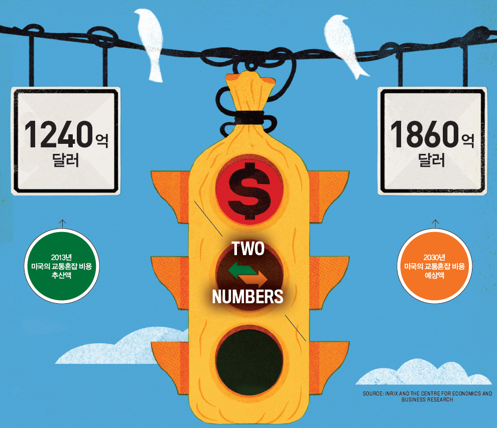 최근 조사에 따르면 주로 시간과 연료 낭비로 인한 미국의 연 간 교통 정체 비용이 2013년 총 1240억 달러에 달했다. 올해 연방 정부가 간선도로에 배정한 예산의 2배를 웃돈다.