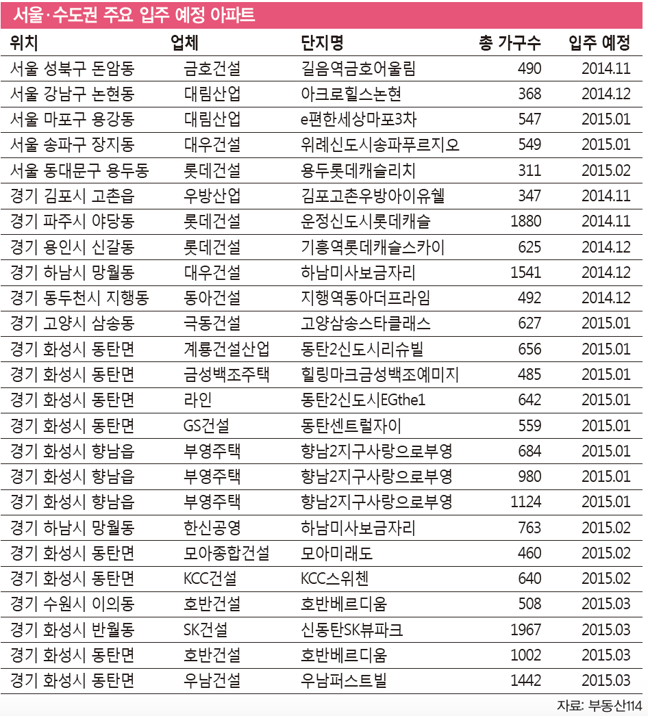 연말부터 내년 봄까지 새 아파트 물량이 많지 않다. 부동산 114 조사에 따르면 올 11월부터 내년 3월까지 서울의 새 아파트 입주물량은 4439가구에 불과하다. 수도권은 3만 가구가 집들이를 앞두고 있지만 일부 지역에 입주물량이 몰려 있어 사정은 비슷할 것으로 예상된다.