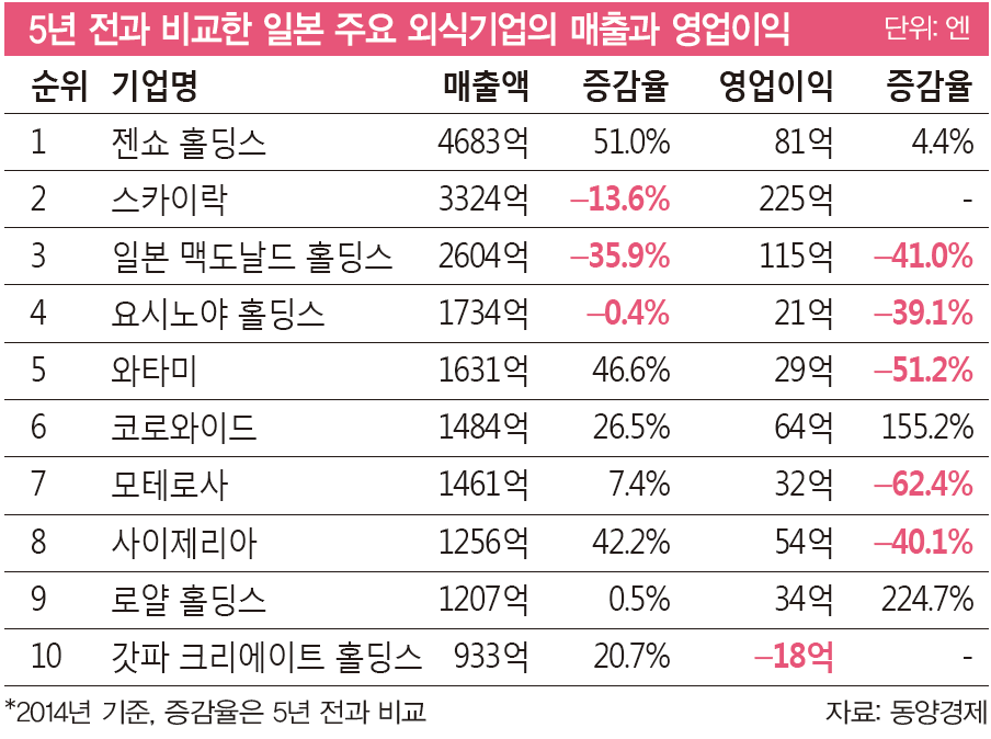 어떻게든 매출을 늘리고자 많은 외식 기업이 신규 출점으로 활로를 모색해왔지만 대량 출점이 더 치열한 경쟁을 불러와 기존 점포의 수익성마저 악화되고 있다. 매출이 늘어난 기업도 이익은 전에 비해 크게 줄었다. 엔저에 따른 원가 부담 증가와 심각한 인력 부족도 걱정거리다. 경기가 오름세를 보이며 여러 업종에서 채용이 활발해져 고된 일에 비해 대우가 뒤쳐지는 외식업계에 좀처럼 사람이 모이지 않는다.