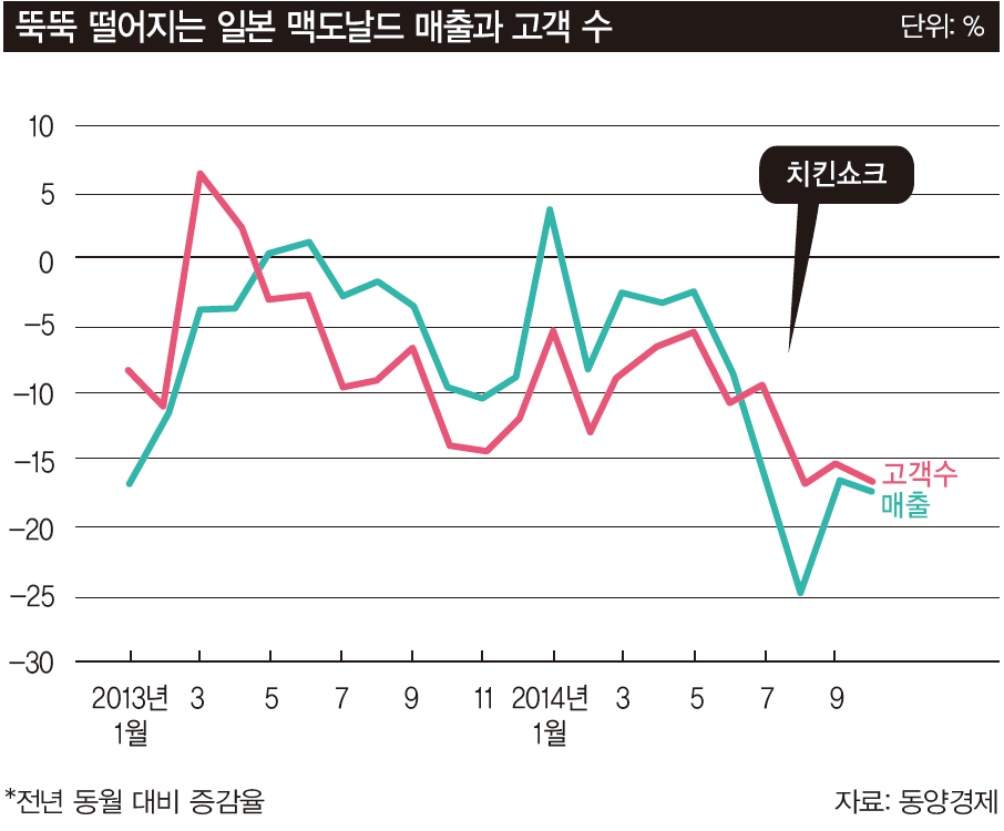하지만 2012년 하반기부터 고객 수가 감소하기 시작했다. 2013년 8월 실적 악화가 확실해지자 하라다 사장은 카사노바 사장에게 자리를 넘겼다. 회사 재건을 위탁 받은 카사노바 사장은 가족 고객 확보를 위한 ‘원점 회귀’ 전략을 내걸고 어린이 고객을 위한 완구시설 병설 매장을 확충하고 장난감을 사은품으로 주는 ‘해피 세트 메뉴’를 늘리는 등 대책을 마련했다. 하지만 때마침 발생한 치킨 쇼크에 제대로 힘 한 번 써보지 못했다. 너겟은 어린이 고객에게 인기가 높은 해피 세트의 핵심 메뉴 중 하나였던 만큼 카사노바 사장이 추진한 가족 고객 흡수 작전에 큰 차질이 생겼다. 일본 맥도날드홀딩스 이마무라 아키라 집행임원은 “치킨 쇼크에 따른 판매 영향을 연내에 마무리 짓고 싶으나, 오래 지속될 가능성도 있다”며 “현 시점에서 섣불리 판단 하기는 어렵다”고 우려했다.