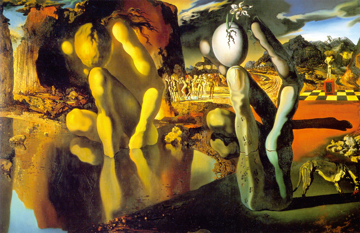 달걀은 달리의 그림에 유난히 자주 등장하는 모티프이기도 하다. 아마도 구원자라는 뜻의 그의 이름, 살바도르와 새로운 삶을 뜻하는 달걀에 어떤 심오한 관련이 있는 것은 아닐까. ‘나르시스의 변신’이라는 작품을 보면, 고개를 숙인 채 연못에 비친 자신의 모습만 슬프게 바라보는 달리의 모습이 나르시스가 돼 왼편에 앉아 있다. 그리고 그 옆으로는 나르시스와 아주 비슷한 형상으로 손가락이 있고 그 위로 부활을 상징하는 달걀이 보인다. 달걀의 껍데기를 깨고 수선화가 활짝 피어올라와 있다. 타인을 사랑할 수 없었던 외로운 소년 나르시스의 영혼이 수선화로 다시 태어난 것이다.
