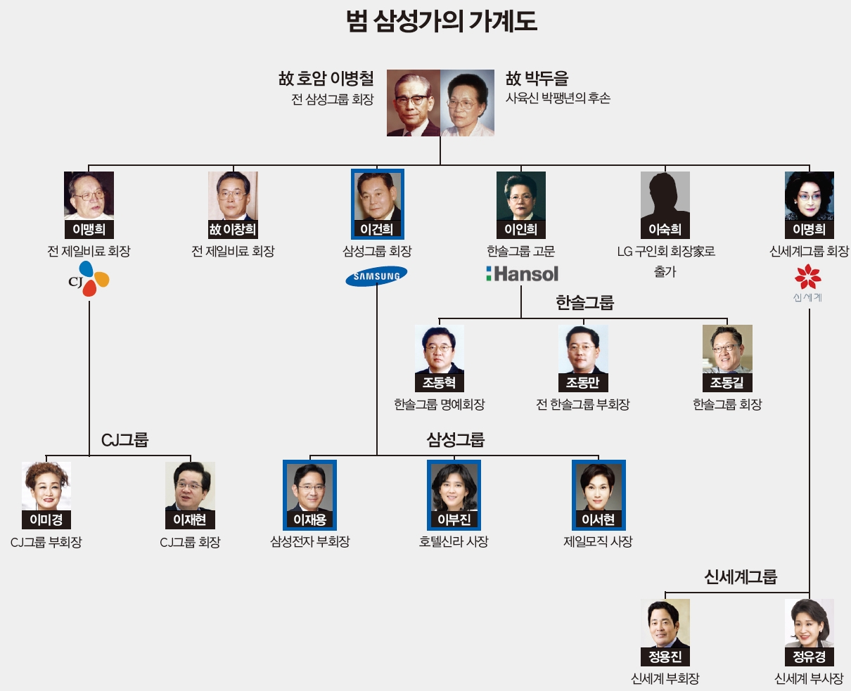 호암의 타계 후 유언대로 이건희 회장은 삼성그룹 회장직을 이어받았다. 이후 장남 이맹희 씨는 CJ그룹, 차남 고 이창희 씨는 새한미디어그룹, 장녀 이인희 씨는 한솔그룹, 5녀 이명희 씨는 신세계그룹의 창업자가 되어 지금의 범 삼성가를 이루고 있다.그로부터 5년이 지난 1976년 9월, 이병철 회장은 일본 도쿄에 갔다가 게이오대학병원에서 건강검진을 받던 중 위암이 발견된다. 재검 결과 위암이 확실하자 도쿄의 암연구소 부속병원에서 수술을 받기로 했다. 그리고 만일을 대비해 출국 전날 가족을 모두 불러 모았다. 그 자리에는 사육신 박팽년의 후손인 부인 박두을 여사, 장남 이맹희씨 부부, 그리고 장녀 이인희 씨를 비롯한 딸들도 모두 참석했다.
