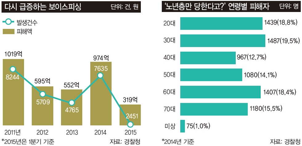 신종 금융범죄가 속출하면서, 속수무책으로 피해를 당하는 이들이 늘고 있다. 경찰청에 따르면 올해 1~3월 사이 전화금융사기(보이스피싱) 발생건수는 2451건으로 지난해 같은 기간 1316건에 비해 86%나 증가했다. 검거인원도 지난해 958명에서2239명으로 급증했다. 2006년 우리은행 고객이 국세청을 사칭한 전화를 받고 800만원을 송금한 사건이 발생한 후부터 공식집계된 전화금융사기는 현재까지 총 5만2451건이 발생했다. 피해액은 5731억원에 달한다. 2008년과 2011년 각각 8000건 넘게 발생해 절정에 달했다가 2012년 5709건, 2013년 4765건 등으로 감소하는 듯했지만 지난해 7635건으로 다시 늘었다. 올해는 증가세가 더욱 가파르다. 역대 최대치였던 2008년(8454건)보다 훨씬 빠른 추세다.