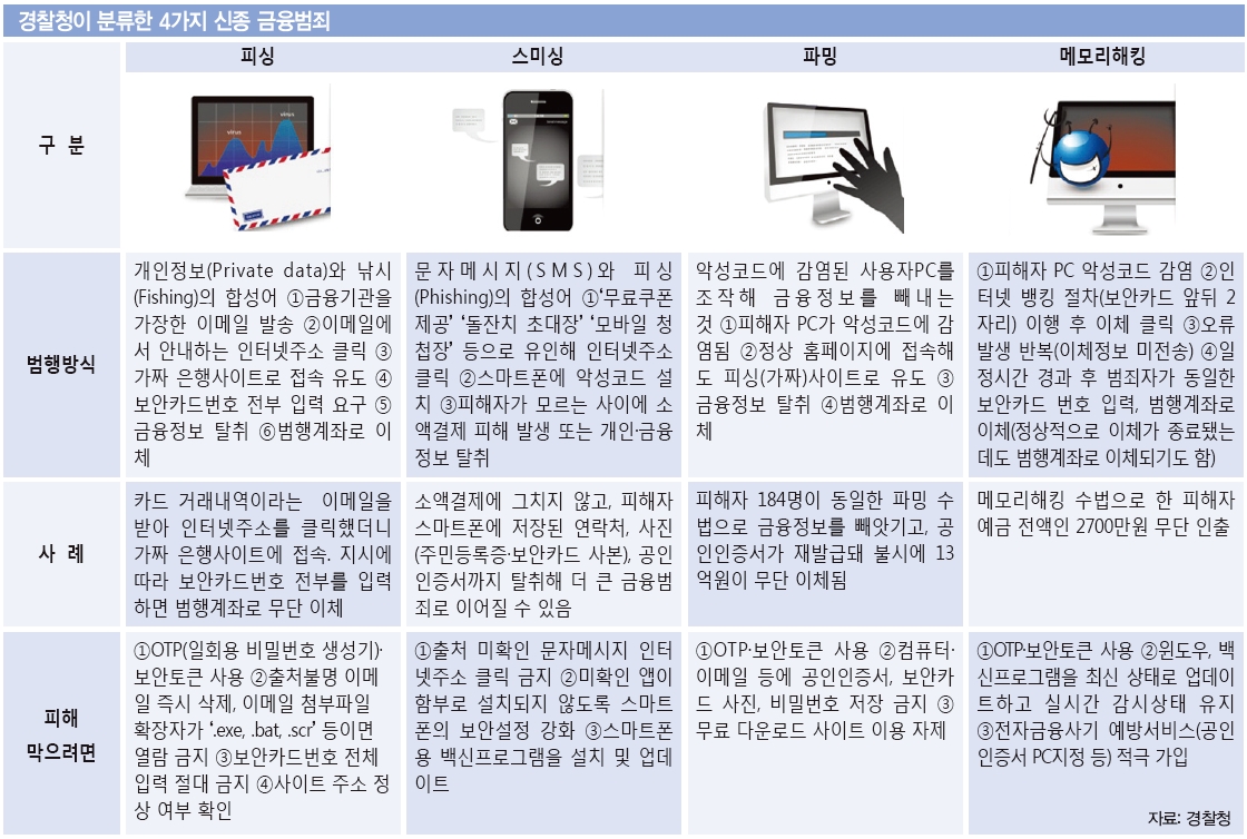 경찰이 분류하는 신종 금융범죄는 크게 피싱(Phishing)·스미싱(Smishing)·파밍(Pharming)·메모리해킹 4가지로 나뉜다. 피싱은 전화로 유인해 돈을 갈취하거나 이메일로 가짜 인터넷 사이트에 접속하도록 한 후 보안카드 번호를 입력하게 한 뒤 금융정보와 예금 잔액 등을 인출해가는 수법이다. 이 중 가장 흔하고 익숙한 게 보이스피싱이다. 너무도 뻔한 거짓말부터 알고도 당할 수 밖에 없는 기발한 사기까지 수법이 나날이 진화하고 있다.