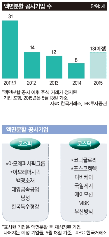한국거래소에 따르면 올 들어 5월 7일까지 액면분할을 발표하고 재상장을 준비 중인 종목(코스피·코스닥 포함)은 총 13곳이다. 지난해에는 8곳에 불과했다. 아모레퍼시픽을 시작으로 코스피에 상장돼 있는 백광소재·태양금속공업·남성 등이 5월 중 액면분할을 통해 주식시장에 복귀한다. 코스닥 시장에서는 지난 4월 포스코켐텍·코닉글로리가 액면분할 후 재상장된 데 이어, MBK·디비케이·부산방직·에이모션·국일제지 등이 액면분할에 나선다.