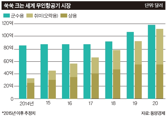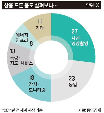 하지만 최근 드론이 주목받는 건 민간 수요 때문이다. 미국 조사회사인 프로스트 앤 설리번에 따르면 2014년 글로벌 드론 시장 규모는 117억 달러(약 13조원)다. 그러나 2020년에는 228억 달러(약 25조원) 규모로 커질 전망이다. 상용과 취미(오락)용을 더한 민간 수요가 시장 확대의 견인차다. 2020년엔 민간 수요가 군수 수요와 거의 비슷한 규모가 될 것으로 보인다. 그 배경에는 드론의 급격한 보급 속도가 있다. 낮은 가격이 큰 역할을 했다. 배터리나 GPS(위성항법장치) 기기, 무선통신 모듈과 같은 전자 부품의 고성능화와 대량 생산 덕분이다. 싸게는 10만엔(약 90만원) 정도에 여러 개의 프로펠러를 단 드론(일명 멀티콥터)을 시중에서 쉽게 구입할 수 있다. 이러한 부품은 스마트폰이나 태블릿에도 사용할 수 있다. 활용 범위가 넓은 만큼 관심도 커지고 있다.