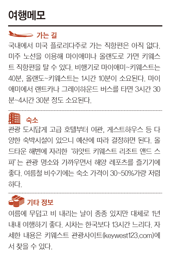 키웨스트는 미국 플로리다 반도에서 남서쪽으로 이어진 여러 섬 가운데 가장 끝에 있다. 점처럼 연결된 섬을 ‘플로리다 키(key·산호초로 둘러싸인 낮은 땅)’라고 부르는데 키 중 가장 서쪽(west)에 있는 섬이라고 해서 붙은 지명이다. 한겨울인 1~2월에도 낮 평균기온이 20도를 웃도는 따뜻한 기후를 자랑해 미국인들에게는 최고의 피한(避寒) 휴양지다.