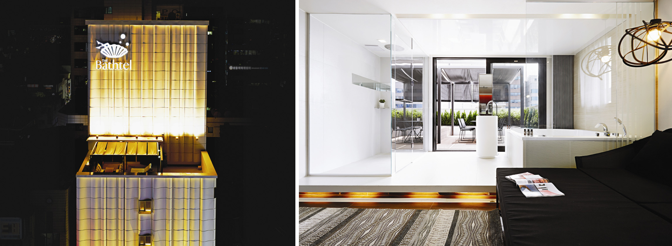 인천시 남구 주안역 일대는 인천 지역에서 숙박업소가 가장 많은 곳이다. 남구에 등록된 호텔과 모텔 200여 개 중 이곳에만 180여 개가 들어서 있다. 지난해 5월 욕실 브랜드 새턴바스가 오픈한 ‘더 바스텔’은 그 중 가장 눈에 띈다. 호텔에 목욕 문화를 접목한 콘셉트로, 이 일대에서 유일한 부티크 호텔이다. 지하 1층 지상 8층에 39개의 객실을 갖춘 이곳은 새턴바스 제품의 전시장이기도 하다. 욕조와 컬러를 달리한 13개 타입 객실 어디에 들어서든 룸 전체 크기의 40% 정도를 차지하는 욕실이 먼저 눈에 들어온다. 영화 ‘하녀’에서 전도연이 몸을 담갔던 600만원 상당의 타원형 욕조, 완전 방수스크린을 장착해 TV는 물론이고 인터넷과 MP3 등의 엔터테인먼트를 즐길 수 있는 1000만원 상당의 스크린 욕조가 대표적이다. 박준 새턴바스 호텔사업부 본부장은 “새로 집을 짓거나 욕조를 개조할 계획을 가진 분들이 제품 체험 차원에서 찾는다”며 “대부분 홈페이지를 통해 룸 타입을 보고 객실을 지정하는데 럭셔리한 대형 욕조와 테라스가 있는 VIP룸이 가장 먼저 예약된다”고 말했다.